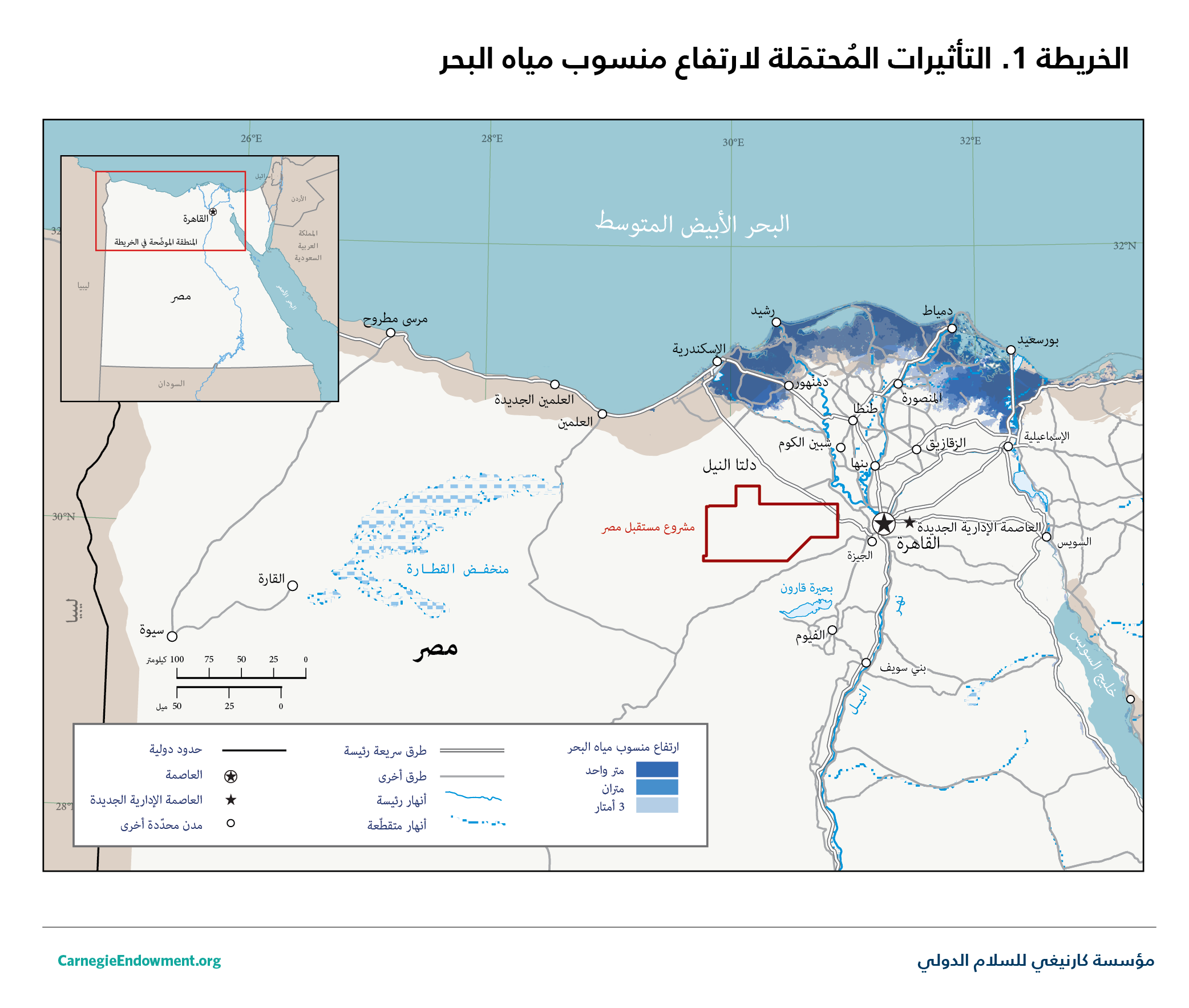 تطرح كل هذه العوامل تحديات خاصة على منطقة دلتا النيل حيث أكثر من 30 في المئة منها عبارة عن أرضٍ منخفضة. تستضيف دلتا النيل ما يقرب من ربع سكان مصر وقطاعات أساسية مثل الصناعة والزراعة ومصائد الأسماك، وتسهم وحدها بنحو 20 في المئة من الناتج المحلي الإجمالي للبلاد.81 ويتمّ فيها حوالى ثلاثة أخماس (60 في المئة) إنتاج مصر من الغذاء، علمًا أنها قد تخسر ما يصل إلى 30 في المئة كحدٍّ أدنى من إنتاجها الغذائي بحلول العام 2030 بسبب التداعيات الناجمة عن تغيّر المناخ.82 كذلك، تتعرّض البنى التحتية الخاصة بالطاقة في المناطق الساحلية وفي الدلتا إلى خطر ارتفاع مستوى سطح البحر والتأثيرات المرتبطة به مثل العواصف والفيضانات.83