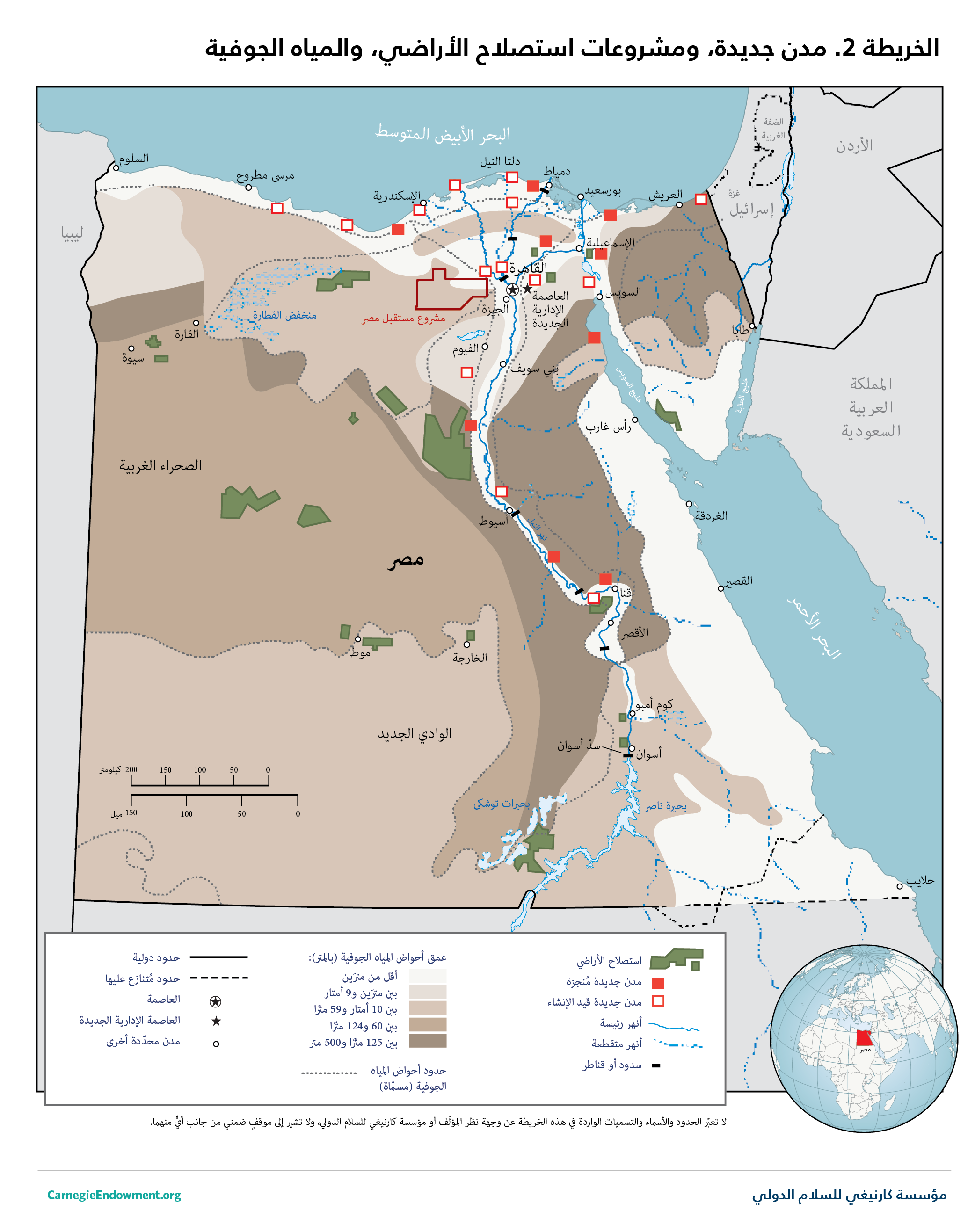تعاني مصر نقصًا كبيرًا في الوحدات السكنية الضرورية لاستيعاب النمو السكاني. وبما أن 43 في المئة من سكانها يعيشون في المناطق الحضرية، وهي نسبة يُتوقَّع أن ترتفع بالقيم النسبية والمطلقة، اتّبعت الحكومة نهجًا ذا شقَّين لتلبية هذه الحاجة.23 فمن جهة، كشفت عن خطط لتحسين المناطق العشوائية أو نقل المقيمين فيها إلى مساكن جديدة في مناطق أخرى بحلول منتصف العام 2021، بتكلفة إجمالية بلغت 63 مليار جنيه مصري.24 ومن جهة أخرى، ثمة 37 مدينة جديدة قيد الإنشاء أو التخطيط بتكلفة 700 مليار جنيه (وفق تقديرات العام 2022) بهدف استيعاب نموٍّ سكاني يُقدَّر أن يتراوح بين 30 و34 مليون نسمة خلال السنوات الأربعين المقبلة.25