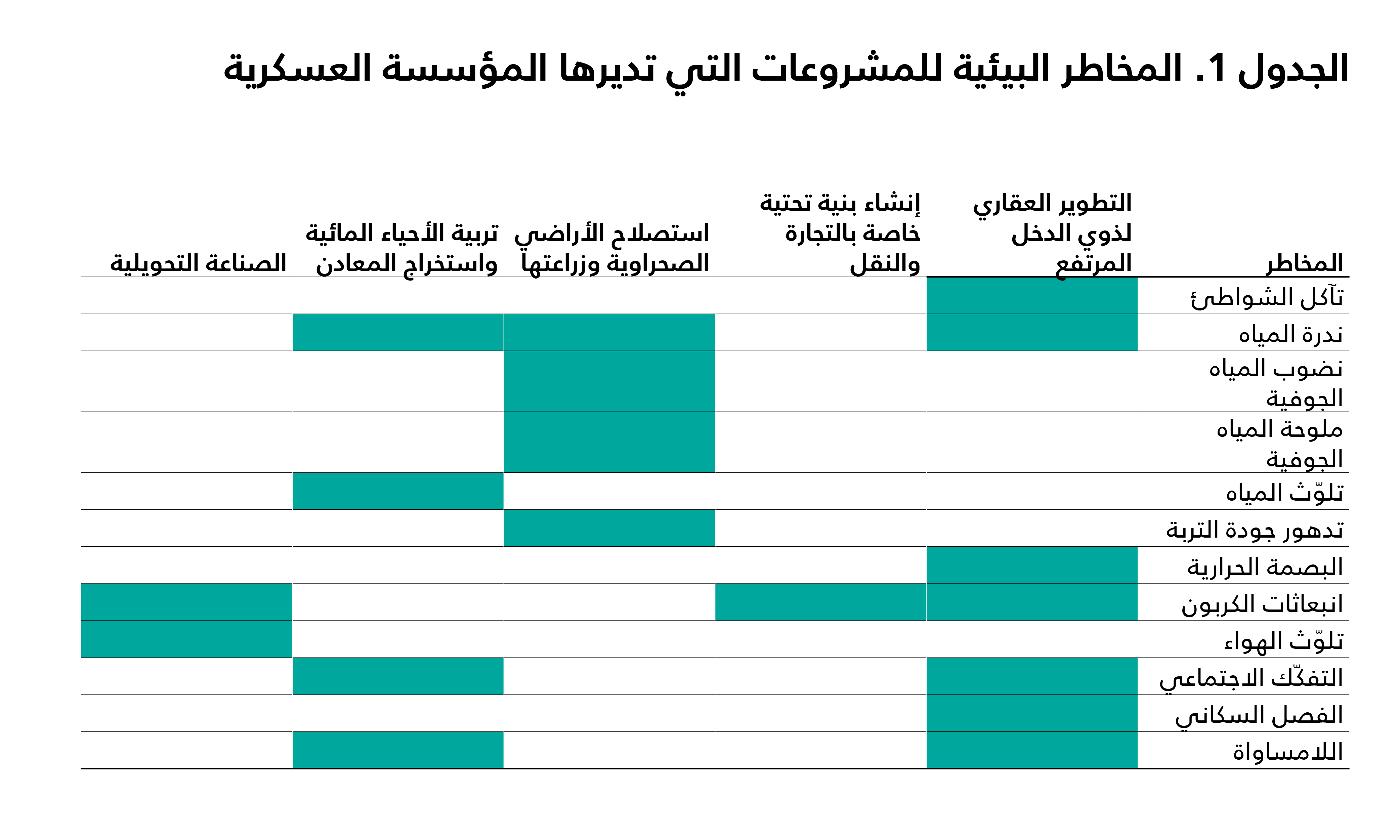 تتولّى الهيئات العسكرية حصّة كبيرة من مشروعات الإسكان العام والبنى التحتية المموَّلة من الحكومة، بما في ذلك المشروعات القومية العملاقة لاستصلاح الأراضي الصحراوية، ناهيك عن أنها تُدير مشروعاتها الخاصة في قطاعات متنوعة مثل الزراعة والأعمال التجارية الزراعية، والصناعة التحويلية، واستخراج المعادن. وتنطوي جميع هذه الأنشطة على عواقب بيئية مُحتملة هامّة، من ضمنها زيادة انبعاثات الكربون، وتلوّث الهواء، وتلوّث المياه والإفراط في استخدامها، وتدهور التربة. تُصوَّر المشروعات "العملاقة" التي تديرها المؤسسة العسكرية بأنها ستسهم في سدّ النقص المزمن في الوحدات السكنية في البلاد وفي البنى التحتية، وتعزيز الأمن الغذائي، ومعالجة تدنّي الإنتاجية الاقتصادية، لكنها قد تفاقم أيضًا التهديدات المُحدقة بنسيج نظامٍ بيئي يشمل السكان والأنشطة الزراعية والموارد المائية، ويرزح أساسًا تحت وطأة الضغوط الناجمة عن تغيّر المناخ. يتبنّى مسؤولو الدولة والجيش بشكلٍ روتيني خطابًا "أخضر" مناصرًا للبيئة، بيد أن المعلومات حول الأنشطة التي تديرها المؤسسة العسكرية في المجال المدني تبقى محجوبةً. ونظرًا إلى غياب الشفافية هذا، من المستحيل إجراء تقييمات مستقلة للتبعات البيئية الناجمة عن هذه المشروعات أو لإسهامها المُحتمَل في جهود تخفيف حدّة تغيّر المناخ والتكيّف معه.