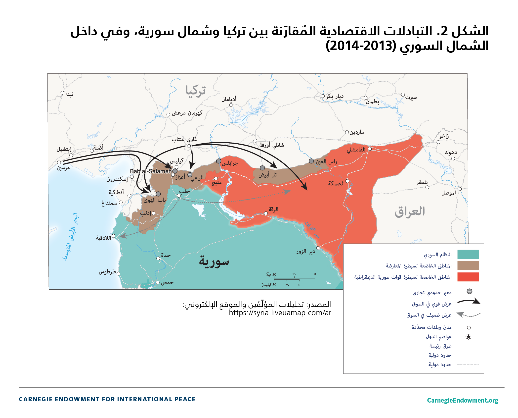 كان للصراع السوري تأثيرٌ مهمٌ آخر على المناطق الحدودية، إذ أدّى إلى إعادة تشكيل الشبكات الاقتصادية العابرة للحدود، وبروز مراكز وقوى اقتصادية جديدة خارجة عن سيطرة النظام السوري. وبدا هذا جليًا بشكلٍ خاص على طول الحدود الشمالية مع تركيا، ولا سيما عبر تهميش مدينة حلب الخاضعة لسيطرة النظام والحدّ من دورها كمركزٍ اقتصادي لصالح بلدات حدودية تجمعها روابط قوية مع تركيا والشركات التي تتّخذ من تركيا مقرًّا لها. تختلف الأمثلة على طول الحدود السورية التركية باختلاف من يسيطر على منطقةٍ محدّدة، لكن في جميع الحالات، يسلّط الوضع على الأرض الضوء على ضعف قبضة نظام الأسد في المناطق الحدودية الشرقية.