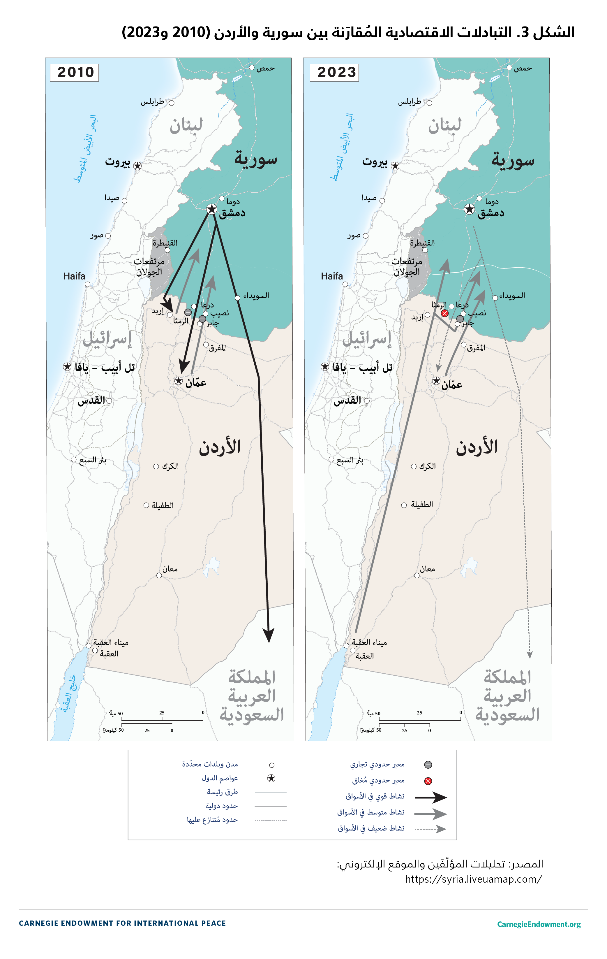 لا بدّ من الإشارة إلى أن مواجهة الأردن للنموذج الأمني الإيراني في جنوب سورية كانت خجولةً مقارنةً مع الردّ الإسرائيلي له. فقد سعى الأردن، منذ تقاربه مع النظام السوري، إلى التعاون مع دمشق للحدّ من التهديدات الآتية من الحدود السورية، من خلال عقد اجتماعات عدّة رفيعة المستوى ضمّت مسؤولين أمنيين وعسكريين.125 وفي موازاة ذلك، أصبح الأردن أيضًا أشدّ حزمًا في تصدّيه للمهرّبين على حدوده مع سورية،126 مُحاوِلًا في بعض الأحيان استهدافهم داخل سورية،127 مع العلم أنه سعى أيضًا إلى الحصول على المزيد من المساعدة في هذا الإطار من الولايات المتحدة.128 لكن على الرغم من تحسّن العلاقات بين الأردن ودمشق، لم يبذل الجانب السوري جهودًا تُذكر للتعاون والمعاملة بالمثل، على الرغم من أن الحدود السورية الأردنية لا تزال تشكّل بؤرةً لانعدام الاستقرار، ما يسمح بازدهار الشبكات المرتبطة بإيران.
