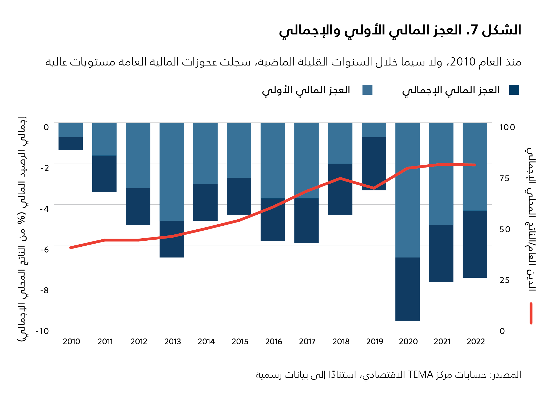 سجّل الرصيد المالي الأولي للبلاد عجزًا سنويًا بدءًا من العام 2011 ولغاية العام 2023. فبلغ متوسط العجز حوالى 4 في المئة من الناتج المحلي الإجمالي منذ العام 2010 (انظر الشكل 7)، مقارنةً مع تسجيله فائضًا في عهد الرئيس زين العابدين بن علي قبل العام 2011. وبعد العام 2017، باشرت تونس عملية توحيد المالية العامة وقلّصت عجزها، غير أن تفشّي جائحة كوفيد-19 تسبّب بانتكاسة حادّة. وبلغ متوسط العجز ما يعادل 9 في المئة من الناتج المحلي الإجمالي بين العامَين 2020 و2022.