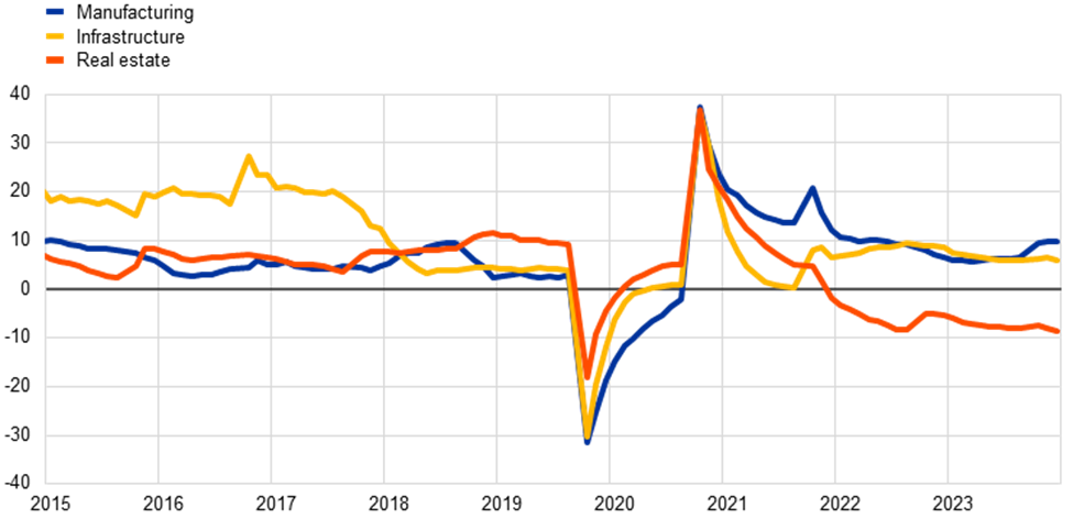 The roots of involution lie in China’s decades-old growth model, but its most recent manifestation emerged in the few years since the end of China’s property bubble in 2021-22. The graph below lists the annual growth rate of fixed asset investment in China by sector. As it shows, before 2021-22 the growth rate of investment in real estate and infrastructure exceeded the growth in manufacturing investment, often substantially.
