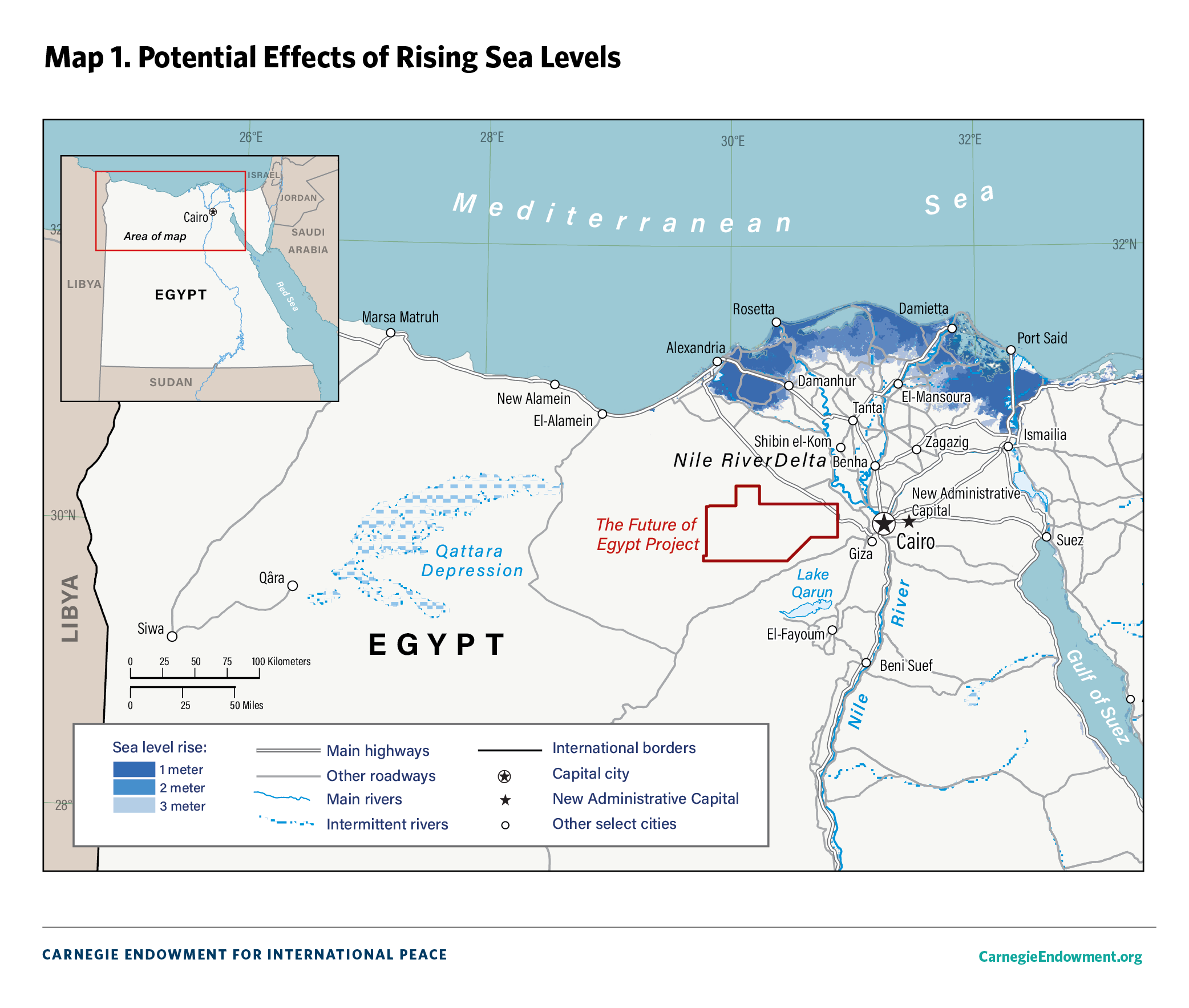 All this poses particular challenges in the Nile Delta, over 30 percent of which is lowland. The delta is home to around one-quarter of Egypt’s population and to industry, agriculture, and fisheries that contribute 20 percent of GDP.81 It is also the place where around three-fifths of the country’s food production takes place, upward of 30 percent of which may be lost by 2030 due to climate change impacts.82 Energy infrastructure along the coast and in the delta is also at risk from rising sea levels and associated impacts such as storm surge and flooding.83