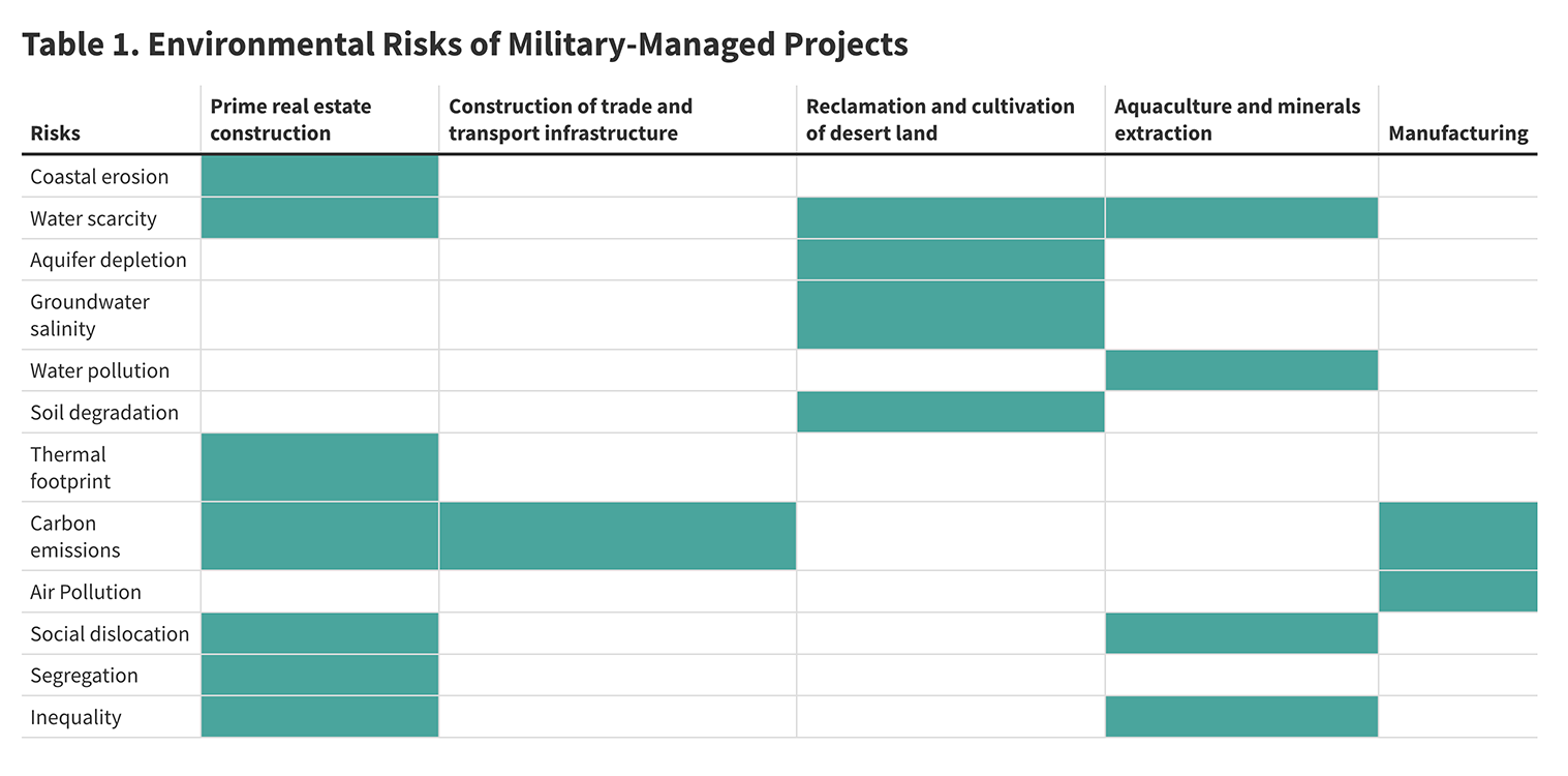 Military-managed activities in the civilian domain are at a particularly high risk of greenwashing—making misleading statements about the environmental benefits of a project so as to obscure and profit from harmful behavior. The Egypt-based public policy research project Alternative Policy Solutions notes, for example, that “Although the government often markets its new urban development projects as eco-friendly, it does not follow an environmental assessment system such as those outlined in its Green Pyramid Rating System (GPRS). . . . In contrast, the government’s architectural model for the new cities shows a preference for high-rise buildings with glass facades, which trap heat and increase the need for energy-consuming cooling systems.”62 The same bulletin points out that the main building material, cement, is highly polluting “since its surface absorbs about 95 [percent] of sun rays and re-emits them back into the atmosphere, significantly raising temperatures,” adding that “very few projects in Egypt rely on less polluting building materials.”