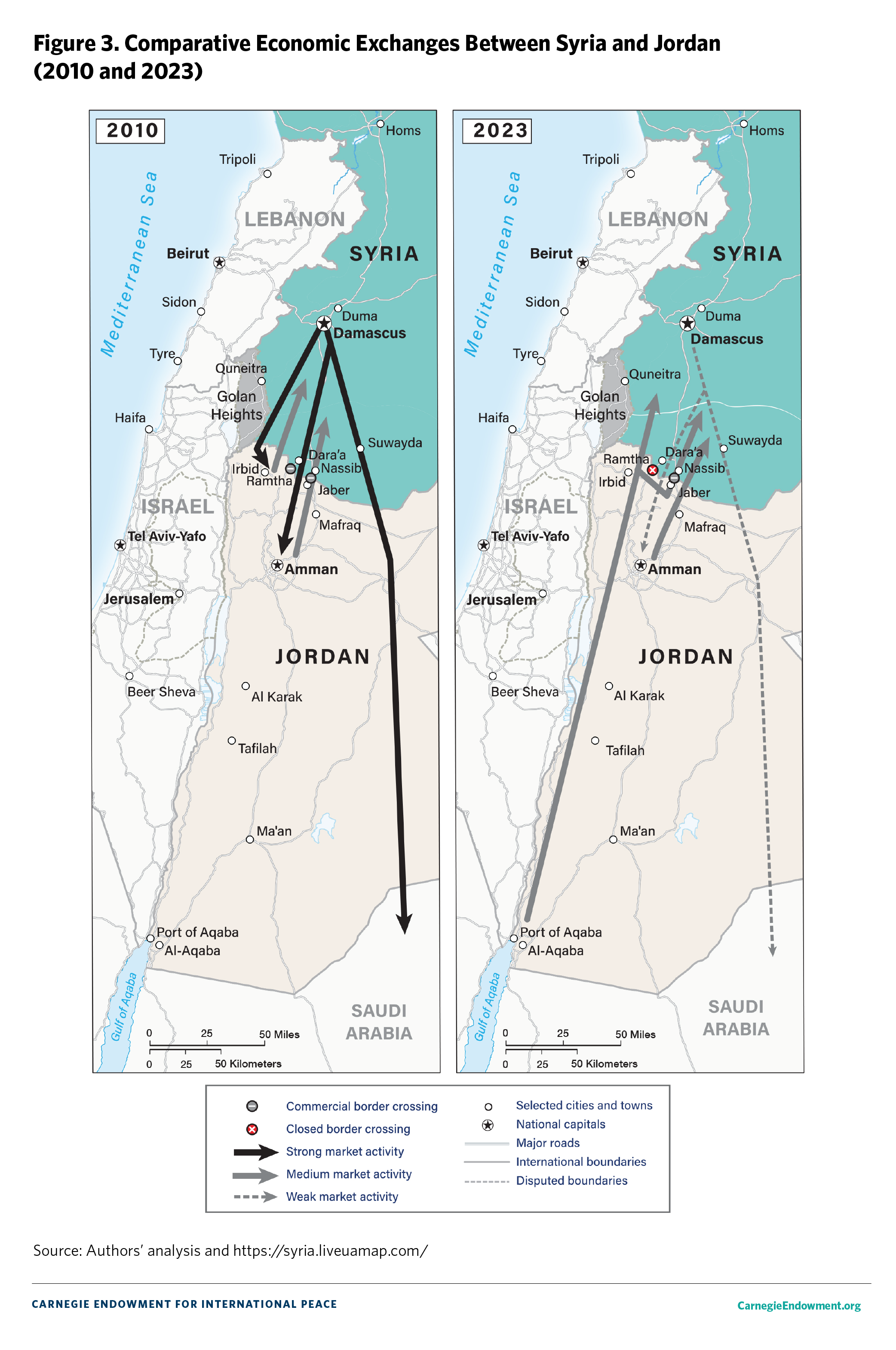 The Syrian conflict has had another major impact on border areas, namely reshaping cross-border economic networks while also giving rise to new economic centers and actors that are outside the Syrian regime’s control. This has been visible notably along the northern border with Türkiye, in particular through the marginalization of the regime-held city of Aleppo as an economic hub in favor of border towns that are strongly tied to Türkiye and Türkiye-based businesses. Along the Syria-Iraq border, the examples vary depending on who controls a specific area, but in all cases the situation on the ground only underscores the Assad regime’s lack of authority over the eastern borderlands.