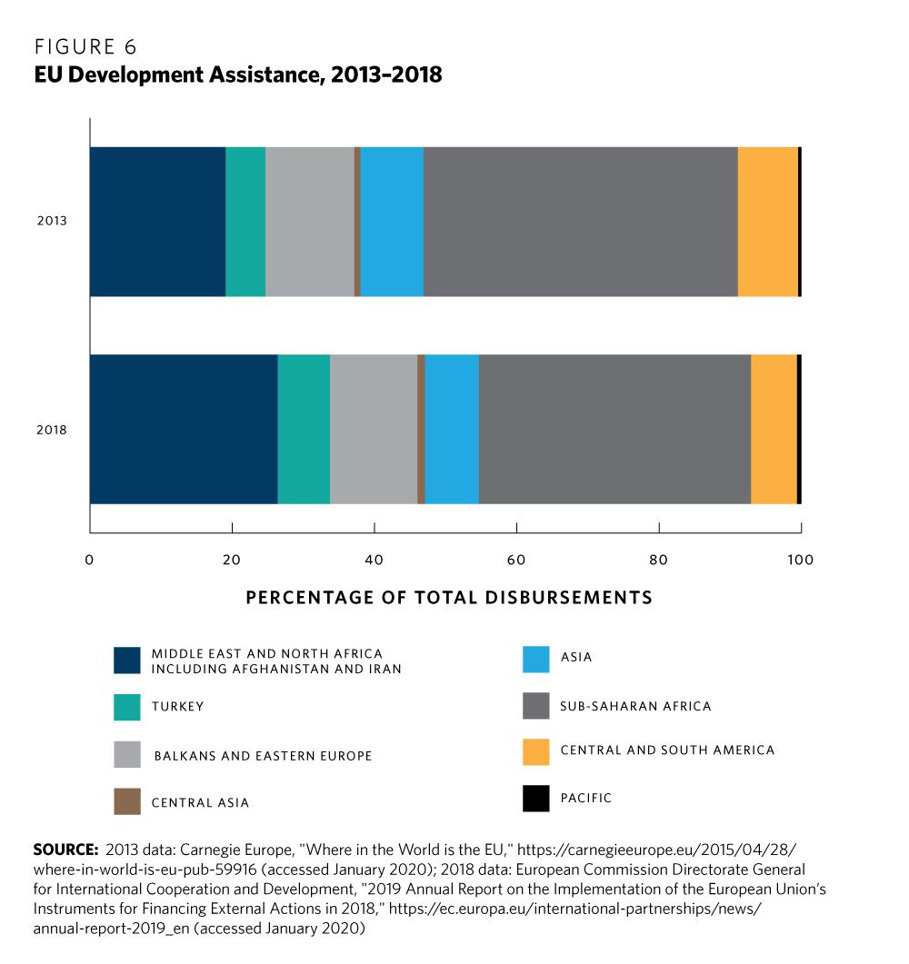 The EU, with its member states, is the world’s largest donor of development assistance. Under the union’s 2014–2020 budget, the collective development assistance spending of the EU institutions amounted to approximately €14 billion ($15 billion) a year. This figure is projected to increase in the 2021–2027 budget, which is under negotiation as of this writing. The European Commission has proposed a 30 percent increase in funding for EU external action, but many member states take a more restrictive approach.