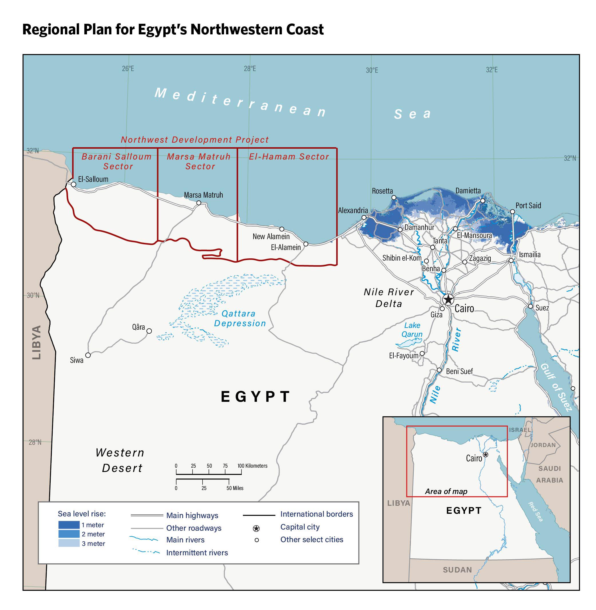 By 2050, more than 10 million people on Egypt’s northwestern coast could be displaced due to the effects of climate change, according to the United Nations Development Program. The Egyptian government recognizes the dangers posed to the northwestern coast, but it is still proceeding with plans to settle 5 million people in the region by 2052—as part of its broad effort to absorb a nationwide population increase of 34 million. To achieve this, it has launched a string of development projects and has undertaken a sweeping revision of its urban, topographical, and administrative plans for the coast.