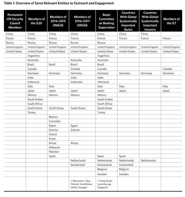 In order to achieve effective reciprocal adherence and be widely accepted among UN member states, the agreement should not be limited to a subset of financial institutions, for example, the Global Systemically Important Banks (as enumerated by the Financial Stability Board) located in a dozen countries. From the standpoint of international stability—and of winning the support of a large number of states—it is worth considering whether protections should be extended to all states’ financial institutions. The idea is that cyber operations that threaten the integrity of any financial institution would create precedents and sow fears that could threaten all states.