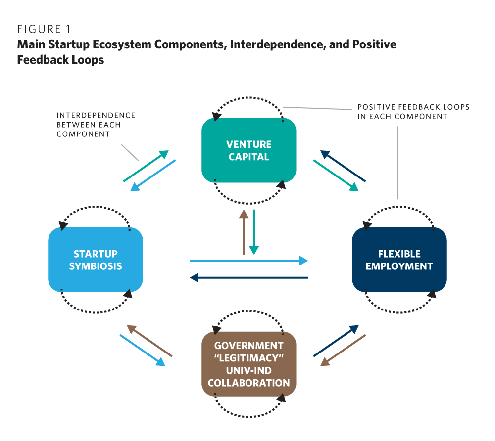 Each of the components also experiences virtuous cycles, or positive feedback loops—the more the component develops, the more its development accelerates. For example, as a country’s VC industry begins to succeed and yield high returns, more startups can get funded. This provides more opportunities for entrepreneurs who can successfully get their startups funded, leading to the possibility of more successful startups, yielding even higher returns for the VCs. As VCs start delivering higher returns on their investments, more large institutional investors and corporations are attracted to invest in VCs, giving VCs more capital to fund startups—thereby attracting more entrepreneurs, and so on. Likewise, if collaboration between industry and universities is well established with multifaceted linkages (such as researchers taking on advising and consulting positions at companies, technologies from their labs spun out into startups, researchers moving in both directions between industry and university labs, and a variety of industry affiliate programs giving researchers a sense of what theoretical breakthroughs can lead to in both academic and industrial value), then subsequent industry-university ties become easier because both sides have deep experience to draw upon.