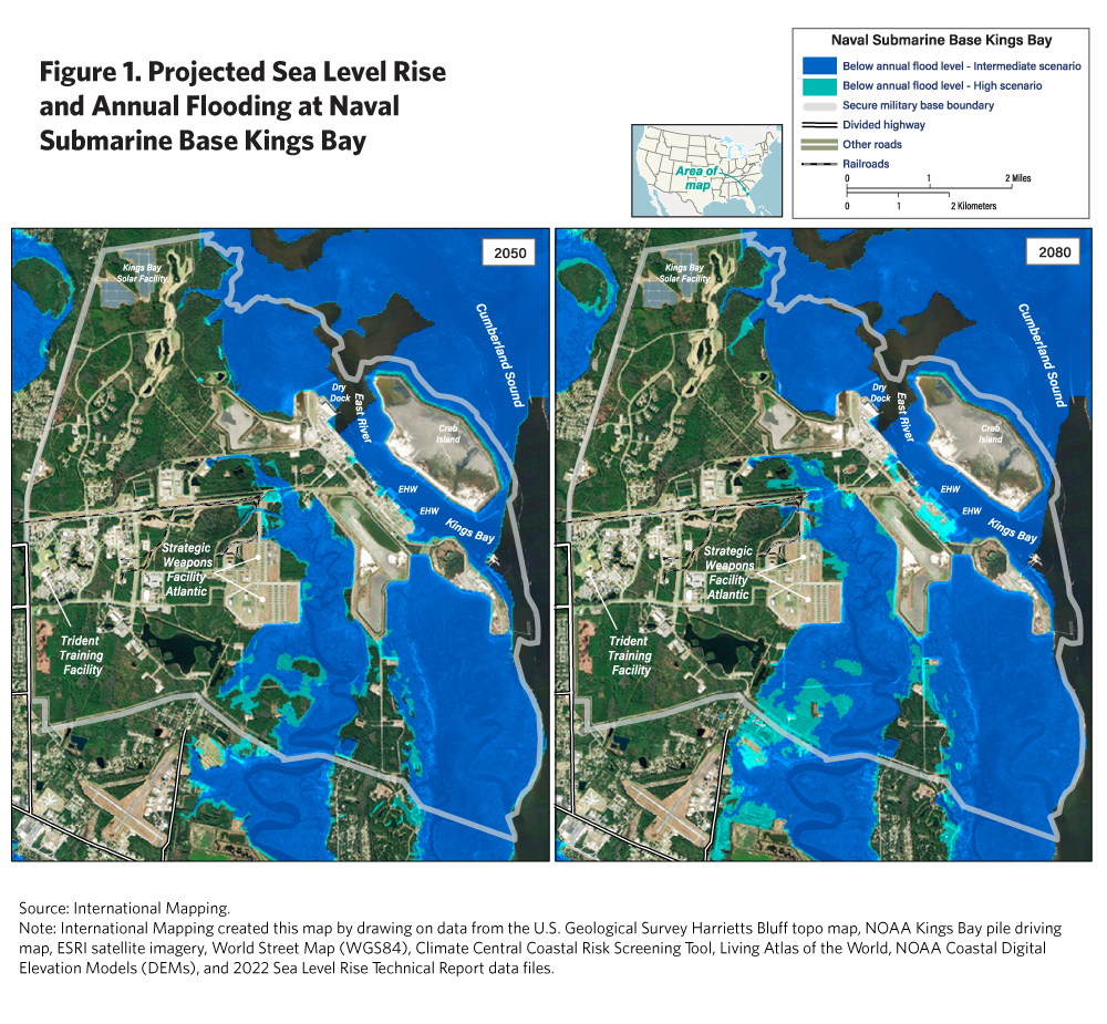 Extrapolating from these global projections, figure 1 depicts likely sea level rise and annual flooding at Kings Bay in 2050—about the year of the planned midlife of Columbia-class submarines—and 2080—about the planned end life of the submarines.28 Notably, the maps do not include potential storm surge. Global warming is expected to contribute to an increase in the severity of extreme weather events such as hurricanes. Warmer atmospheric and oceanic conditions facilitate the evaporation-condensation cycle that encourages more rain and stronger winds, both of which contribute to more powerful storms.29 Paired with rising sea levels, these extreme events would contribute to considerably higher storm surge.30 But it is difficult to project the frequency of such extreme events, hence the exclusion of their effects here. Existing studies and tools that demonstrate the substantial impacts of storm surge on Kings Bay, especially as related to the usability of base land, provide useful, supplementary reference points.31